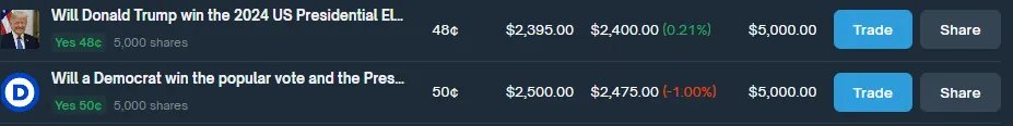 一个重要提示:一定要认真阅读每个市场的规则。有些头寸看起来像是套利机会,但可能隐藏着巨大的风险。比如,如果某位候选人遭遇刺杀,即使你以为自己搭建了一个「稳健套利」,也可能会把所有本金都亏掉。