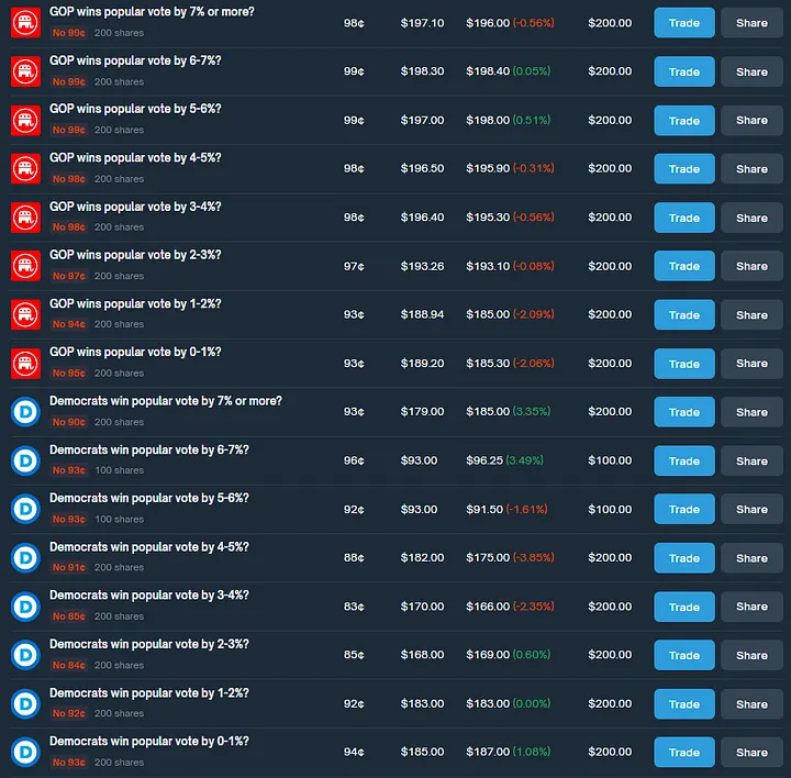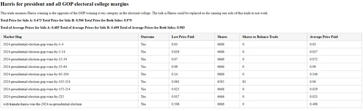 以下是我实际下的单。除了其中 1 笔之外,其余所有交易都会在大选当天获胜。因此,这些交易中所有获胜头寸的总收益(扣除 1 笔亏损)需要大于那笔亏损的金额。