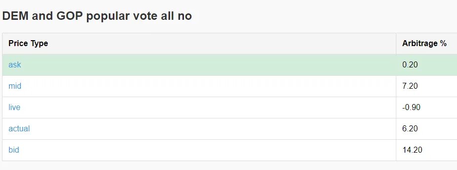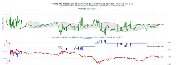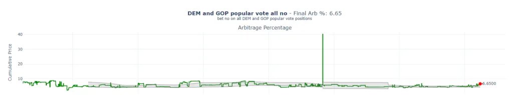这个策略目前显示 2.55% 的套利空间。在这一组合中,我们一方面押注特朗普胜选,另一方面通过下注民主党同时赢得普选票和总统大位来进行对冲。虽然这并不是一个完全等价的对冲(因为民主党有可能在未赢得普选票的情况下赢得总统职位),但根据我的模型,这种情况出现的概率极低。因此,我认为这一对冲结构是稳健的。