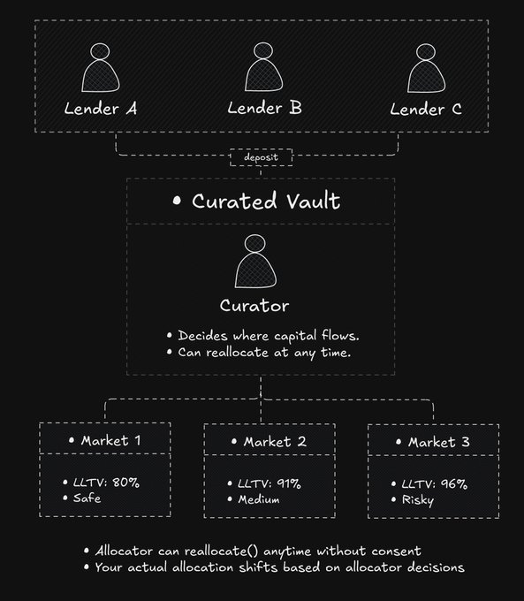 Morpho Blue、Euler 等协议允许任何人创建具有特定参数的借贷市场:指定的抵押物、借出资产、固定的清算贷款价值比 (LTV) 和利率曲线。放贷人存入符合其风险偏好的市场。一个市场的坏账绝不会波及另一个市场。
