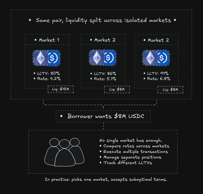 想借 800 万美元的用户无法从单一市场获得满足。他们必须手动比价、执行多笔交易、管理分散的头寸,并跟踪不同的清算阈值。理论上的最优解需要将贷款拆分到四个以上的市场中。