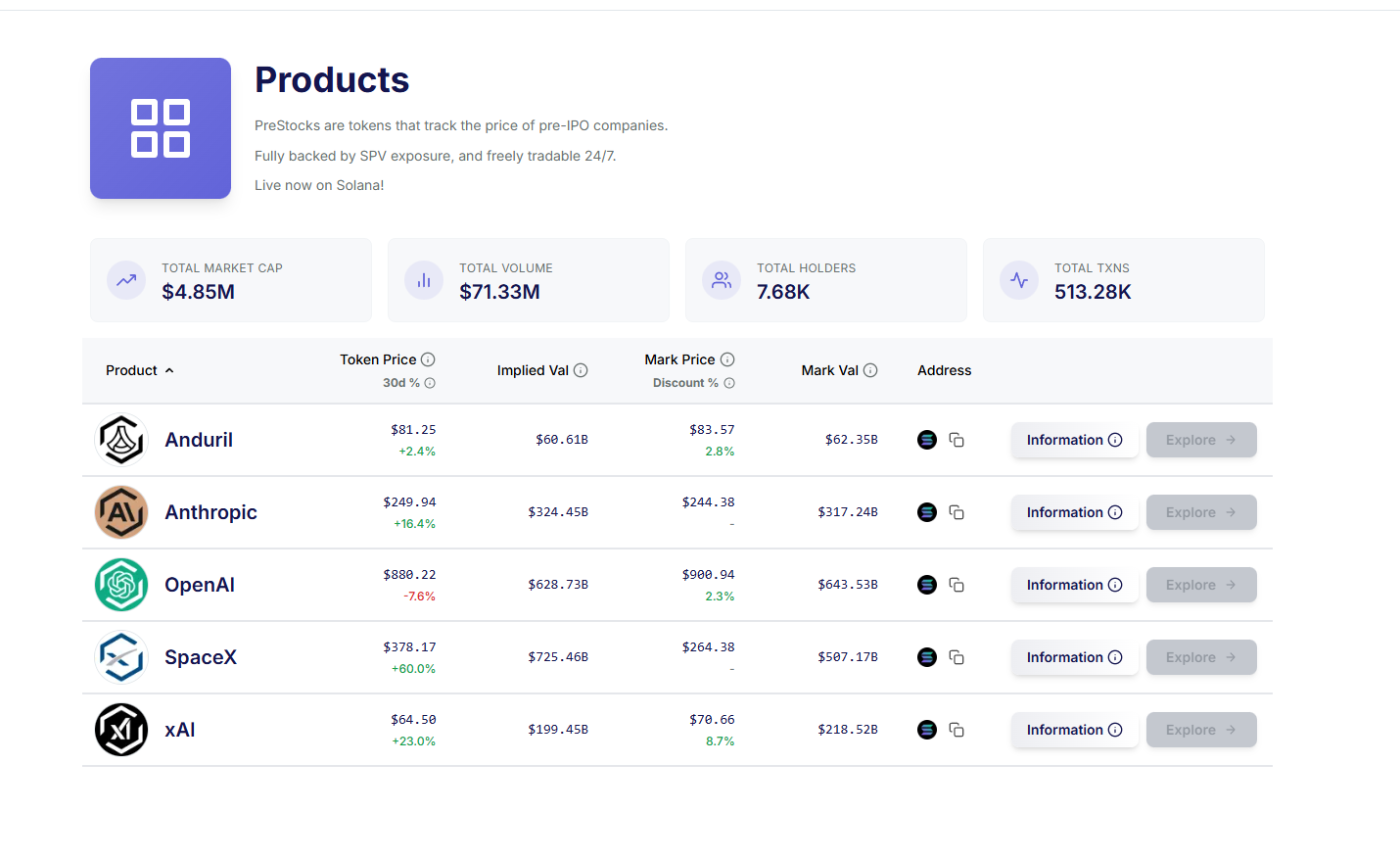 PreStocks 构建在 Solana 网络上。和 Ventuals 不同,PreStocks 是真的将直接或间接投资于标的公司的实体所持有的 IPO 前股权代币化,团队在官网中提及会定期发布第三方认证报告确保代币供应量和所实际持有的股权相对应,也会在能够提供审计费用的主动请求出现时发布。
