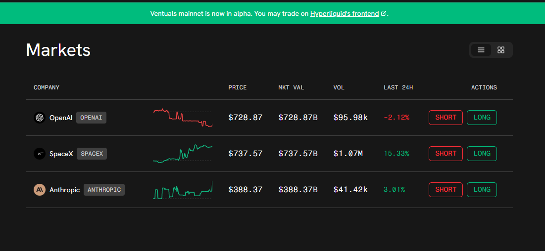 Ventuals 是通过 HIP-3 构建的 IPO 前股权永续合约平台。在 Ventuals 上,交易者并非根据股价进行交易,而是根据对公司总估值涨跌的预期进行交易。在 Ventuals 平台上持有某家 IPO 前公司的头寸,并不意味着拥有该公司的任何实际经济所有权——仅仅是在投机其估值的变化。