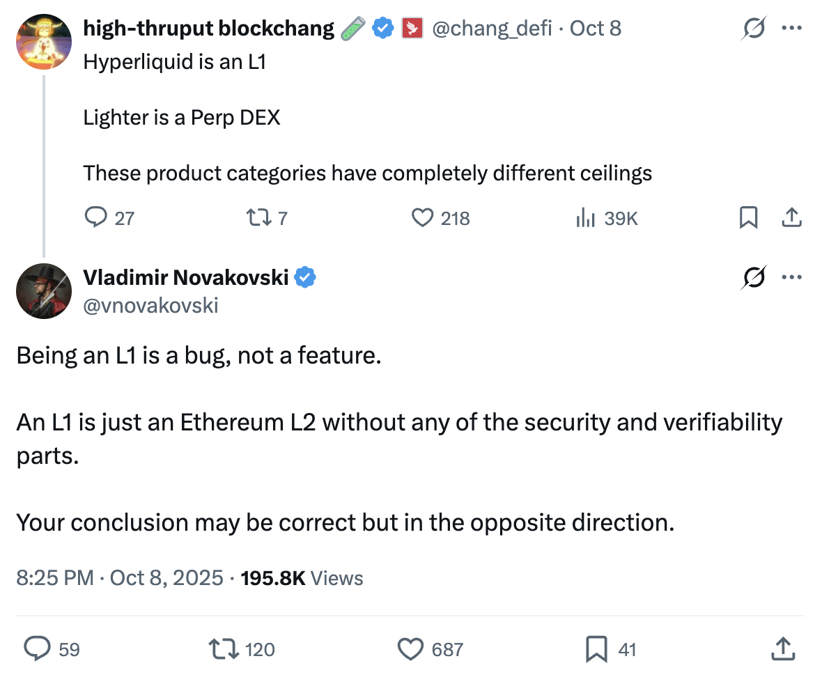 「L1 是个 Bug」Lighter 创始人一句「L1 是一个 Bug,而不是特性」曾经将自己置于风口浪尖,但这句话确实暗示了 Hyperliquid 的痛处。