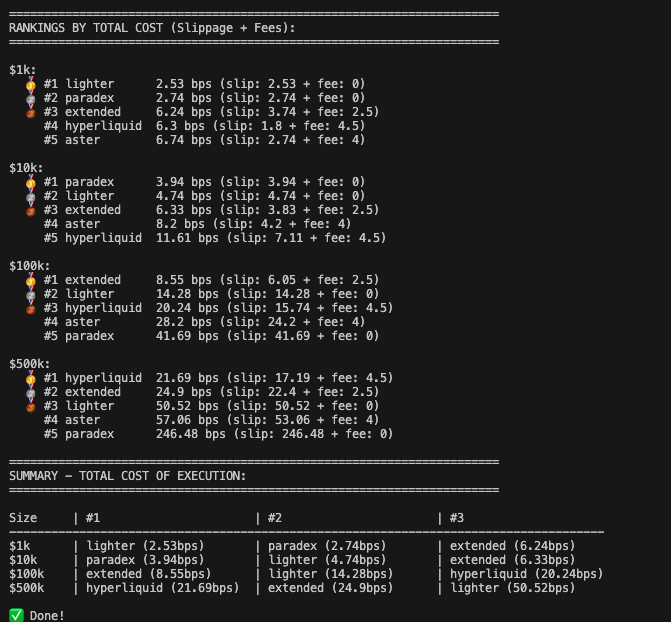 根据社区用户 @ilyessghz2 的测算,Hyperliquid 的低费率优势主要体现在 50 万美元以上的大资金账户,对于本金在 1000 美元到 10 万美元之间的普通交易者,Lighter 的总执行成本(滑点+费用)显著低于 Hyperliquid。