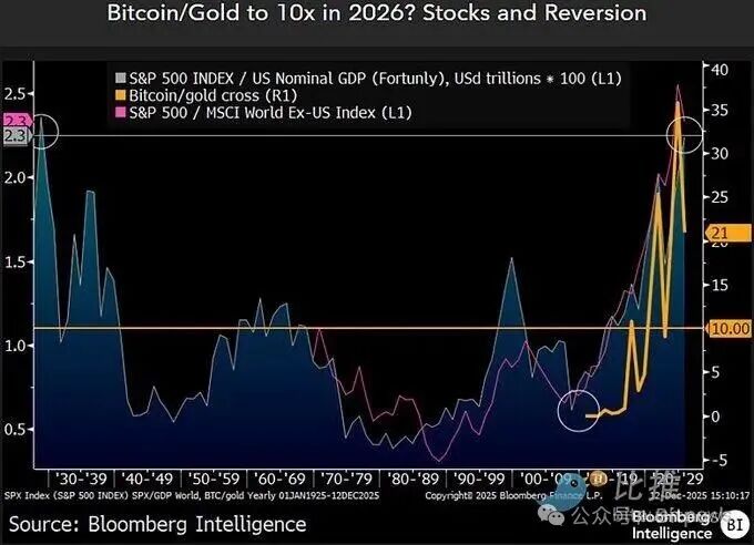 其次,是比特币与黄金之间的相对定价关系。McGlone 特别强调比特币/黄金比值这一指标。该比值在 2022 年底约为 10 倍,随后在牛市推动下快速扩张,并在 2025 年一度达到 30 倍以上。但今年以来,这一比值已回落约 40%,降至 21 倍附近。在他看来,如果通缩压力持续、黄金因避险需求而保持坚挺,那么比值进一步回到历史区间,并非激进假设。