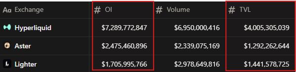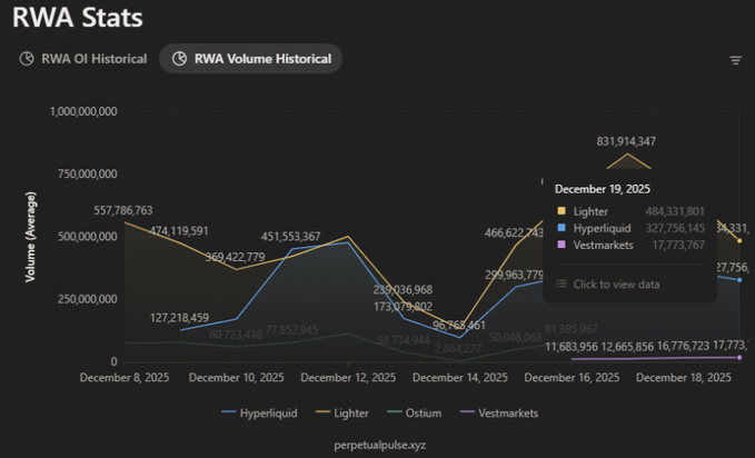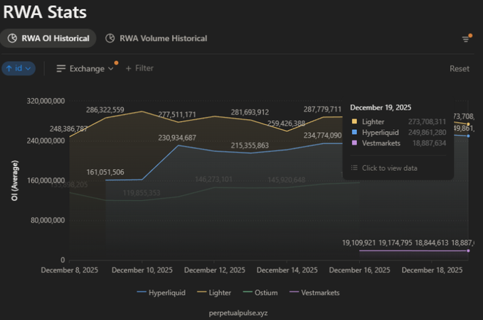 RWA 领导力:数据在说话Lighter 已经在链上 RWA 永续合约的未平仓合约(OI)与成交量两项指标上同时领先。这一组合非常关键:
