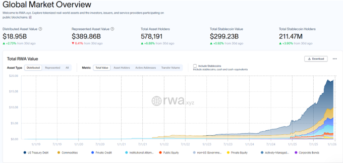 代币化 RWA 在公链上的规模已达到约 189 亿美元以上,且仍处于早期阶段。