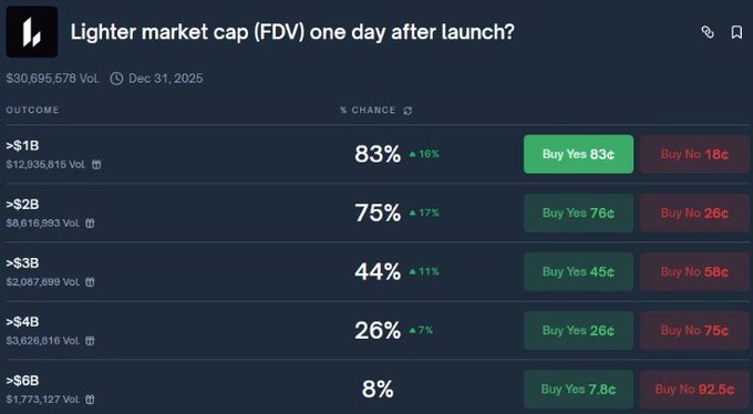 在我看来,当前的情况大致如下:从 PolymARKet 上的交易来看,市场隐含给出的 Lighter 估值大约在 20 亿–30 亿美元之间(至少就目前正在交易的价格信号而言)。