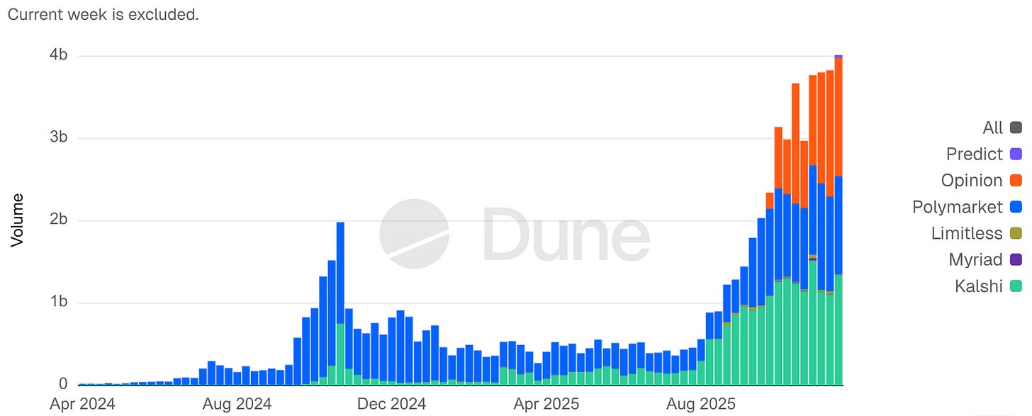 Opinion Trade(由 Opinion Labs 推出)将自身定位为一个「宏观优先」的链上预测交易平台,其市场形态更接近利率与大宗商品的仪表盘,而非以娱乐事件为主导的押注产品。该平台于 2025 年 10 月 24 日上线 BNB Chain,截至 2025 年 11 月 17 日,累计名义成交量已超过 31 亿美元,早期阶段的日均名义成交量约为 1.325 亿美元。在 11 月 11 日至 17 日期间,平台周度名义成交量约 15 亿美元,位居主要预测市场平台前列;截至 11 月 17 日,其未平仓合约规模达到 6090 万美元,在当时仍落后于 Kalshi 和 Polymarket。