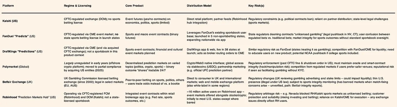 作为回应,FanDuel 与 DraftKIngs 等既有巨头将预测类产品限制在「尚无法律体育博彩」的司法辖区内,凸显分发策略正由监管边界而非用户需求主导。其核心含义已十分清晰:决定规模的不是产品创新,而是监管容忍度。合约设计、结算条款、营销措辞与地理铺开路径,正被系统性地工程化,以通过法律定性审查;能够在被接受的监管框架内运营的平台,将获得更为持久的优势。在这一市场中,监管清晰度本身构成护城河,而不确定性则直接限制增长。