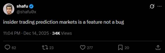 这样的观点有一定的道理,但我想预测市场平台方们本身会抗拒这样的定位,因为长远来看这会伤害散户的信任,整个市场实质上从一个鼓励贡献个人研究与洞察、汇聚群体智慧的博弈平台变成了内幕信息者单方面的「屠杀」,不利于流动性的发展。如果预测市场是这样的,那不如改名为「信息悬赏平台」。