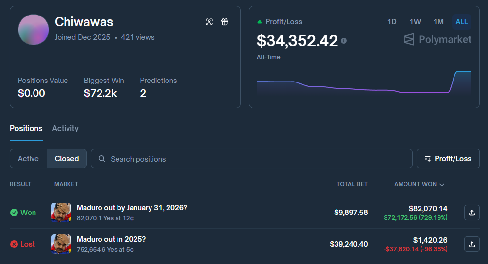 但其实 Chiwawas 早在 12 月 26 日晚就重仓押注了近 4 万美元 在「马杜罗于 2025 年内失权」这一盘口上。