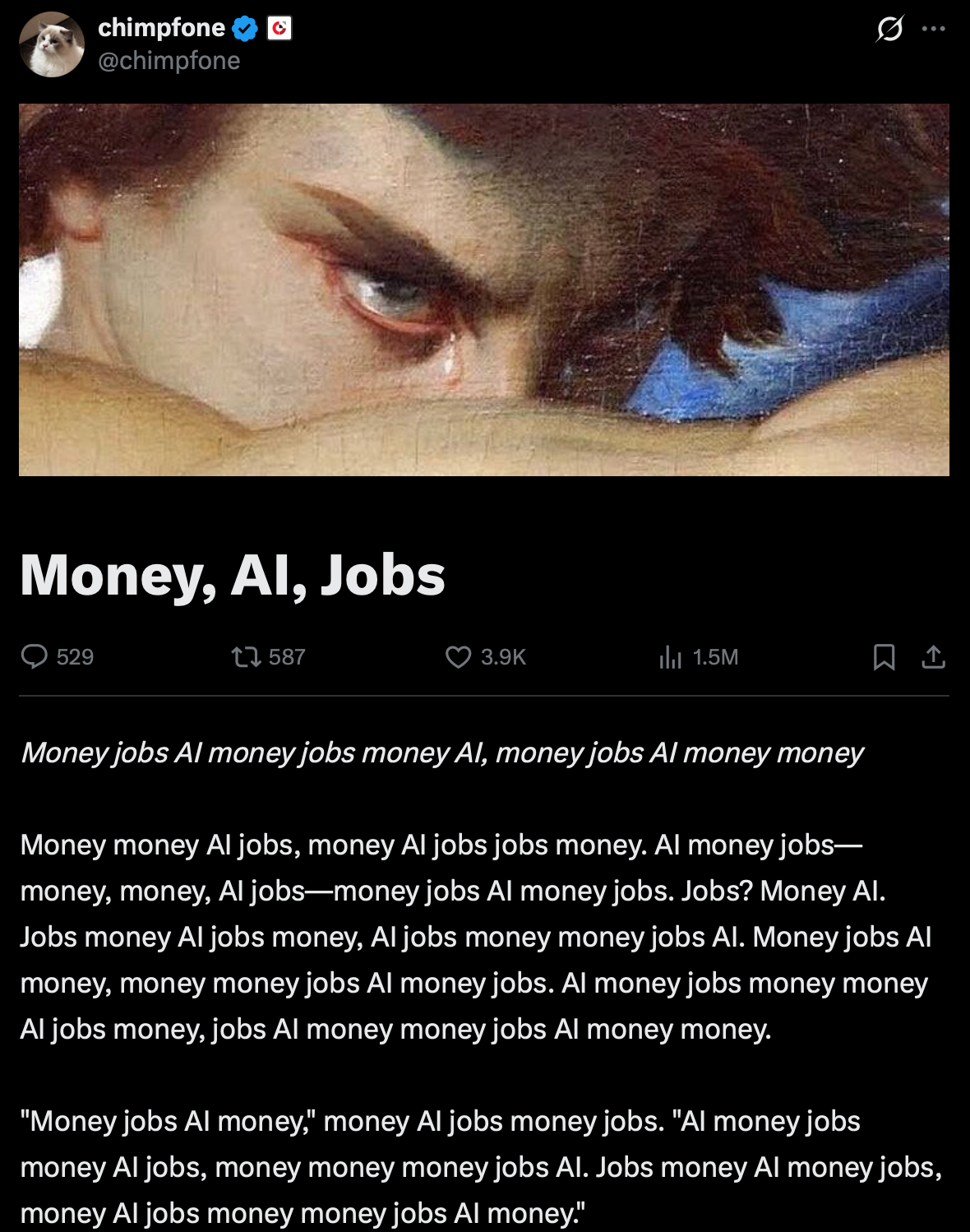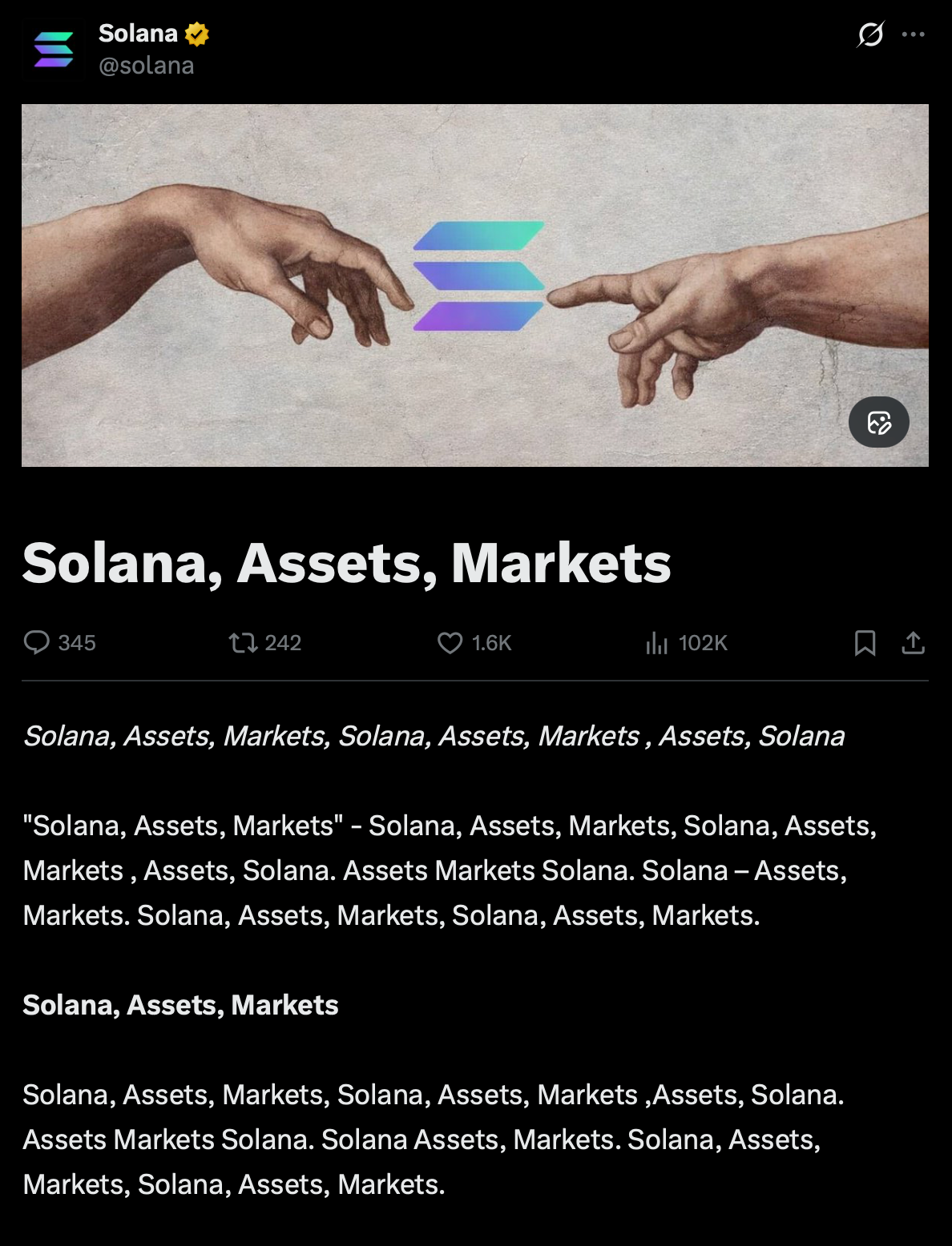 上面是来自 chimpfone 的文章「Money, AI, JOBs」,通篇只有这三个单词,嘲讽 Nikita 的「垃圾信息论」。该创作手法得到了来自 Solana 的认可和借鉴: