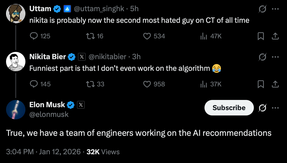 到这里,整个事件的起因就差不多解释清楚了。其实,Nikita 并不负责 X 的内容推荐算法,但一个不小心,他一夜之间几乎成为了币圈最受讨厌的人。他自己也觉得这事情很搞,而更搞的是,马斯克再一次跳出来帮他澄清——Nikita 确实和内容推荐算法没关系,我们有一帮专门的工程师在做这块。