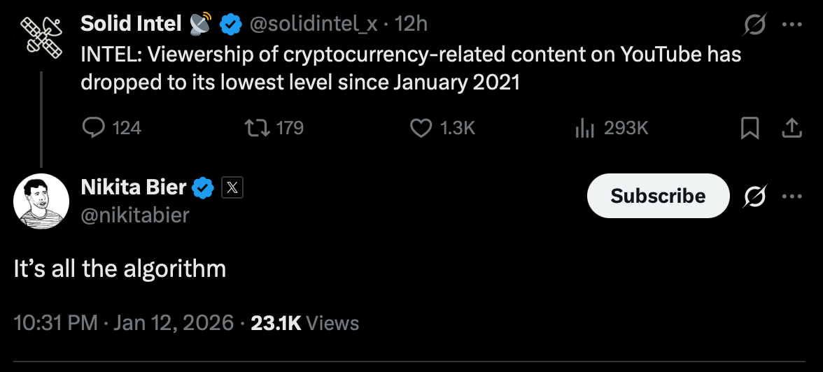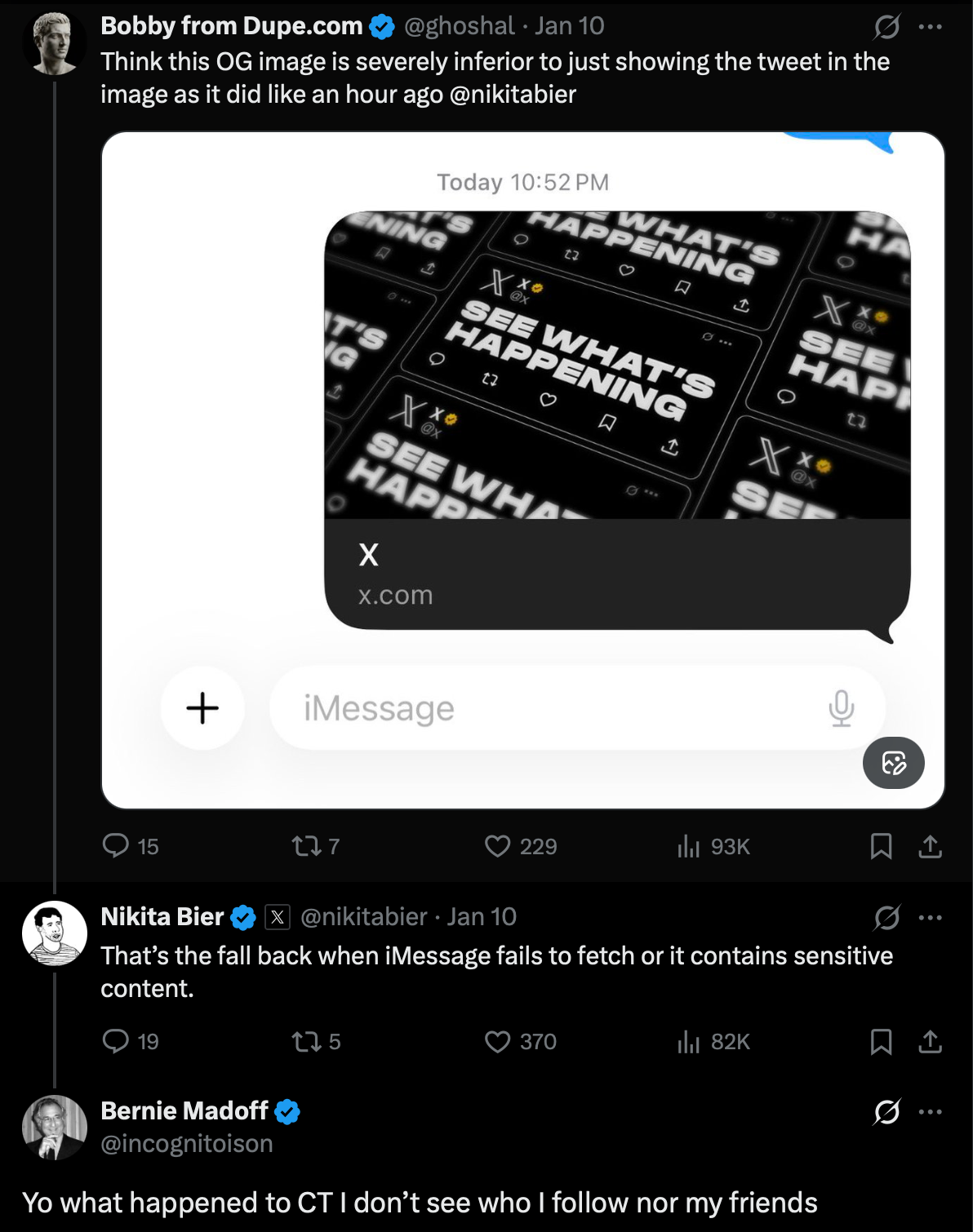 「币命贵」运动Nikita Bier 经常出没在各种和 X 产品问题相关的推文下,作为产品负责人他每天也算在 X 上「高度冲浪」。本来他只是回答了一个简单的问题,有人认为在 iMessage 分享推文链接时,链接封面图直接显示推文内容会更好,他回复说这是 iMessage 获取错误或者包含敏感推文的内容才会显示缺省封面图。而在这时候,一个币圈玩家在 Nikita 的回复下面接着问了一嘴,「Yo,币圈推特怎么了?我既看不到我关注的人,也看不到我的朋友们(所发的内容)」