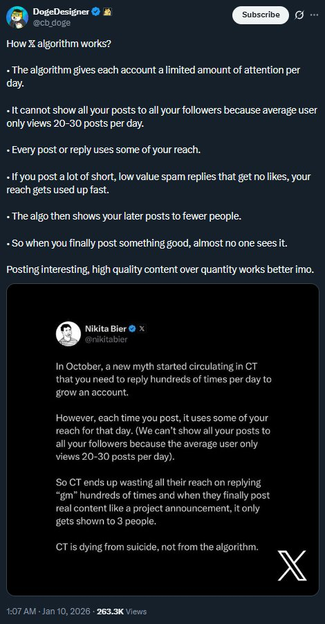 「币圈推特用户每天狂发 GM 浪费自己的曝光度,然后等到发正经内容,比如项目要发布公告的时候,没曝光度了,又跑来怪算法对币圈推特不友好。币圈推特是自杀,和算法没关系。」