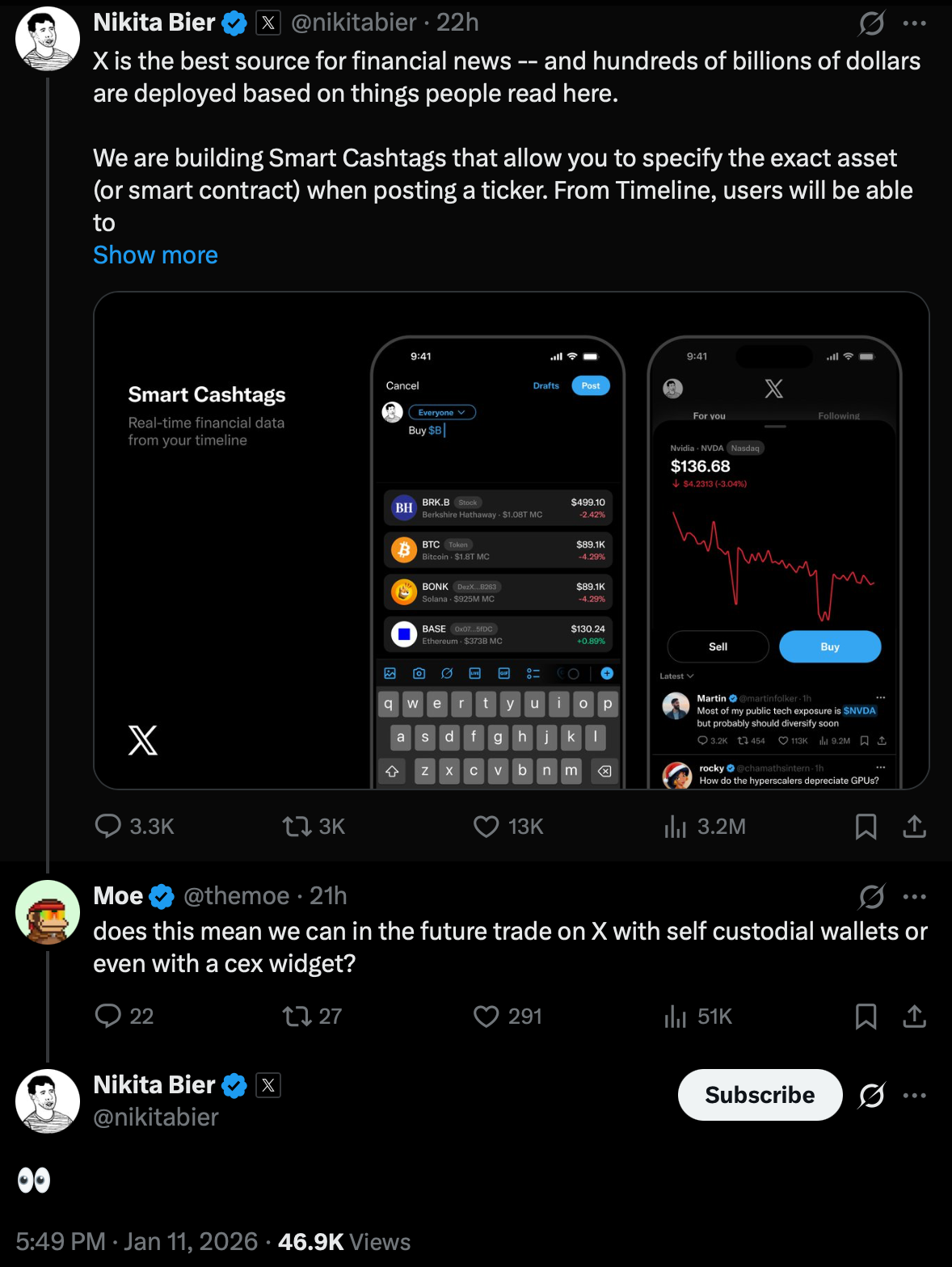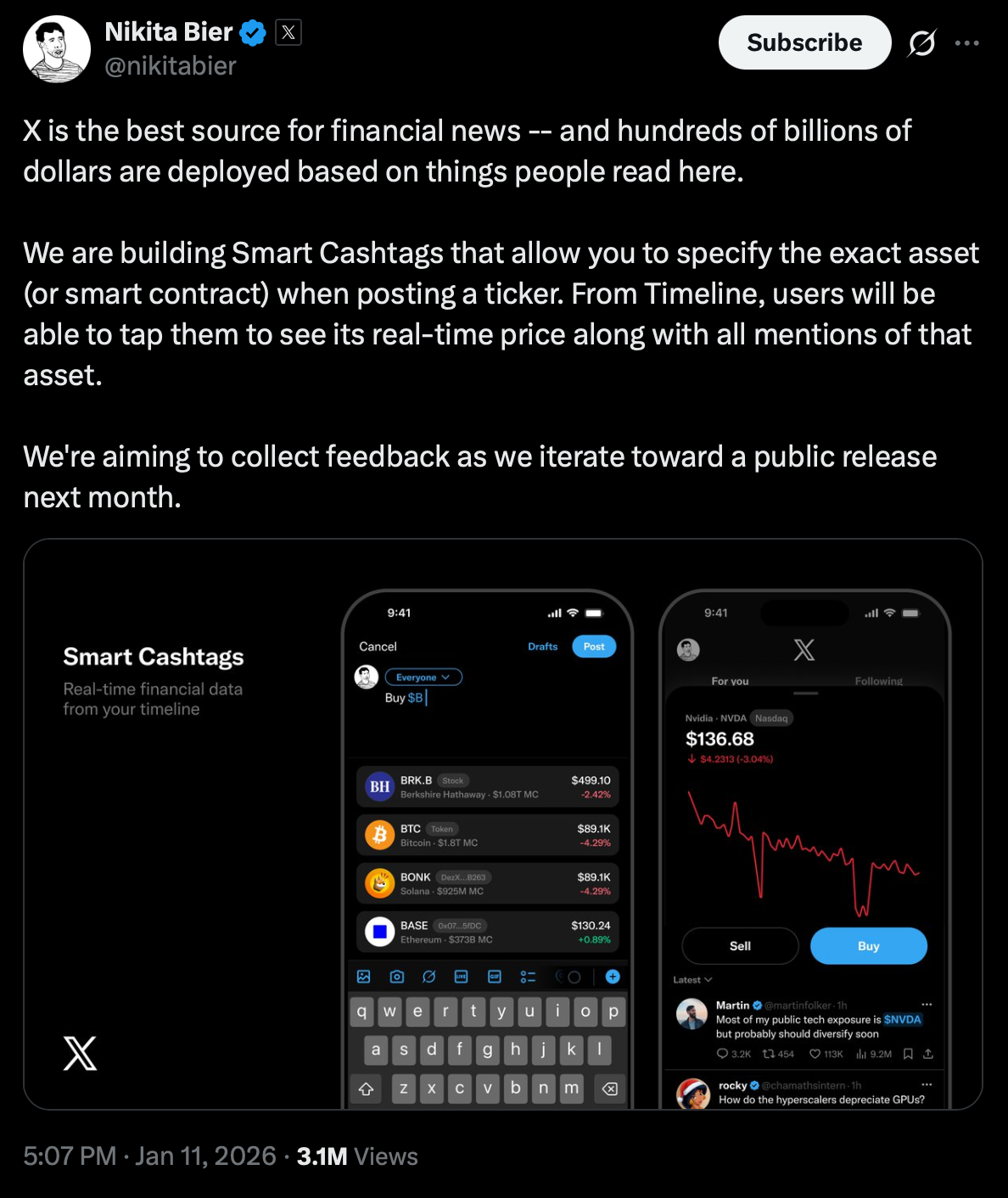 1 月 11 日,X(推特) 产品负责人 NiKIta Bier 宣布,将在下个月公开上线 Smart CASHtags 功能。该功能将使得推文内容中出现的资产 ticker 能够确切指向所提及的目标资产,尤其是加密货币能够根据代币的合约地址来确切指向。当用户点击这些推文中出现的 ticker 时,他们将能够看到对应的实时价格走势以及 X 上围绕该资产的所有讨论。