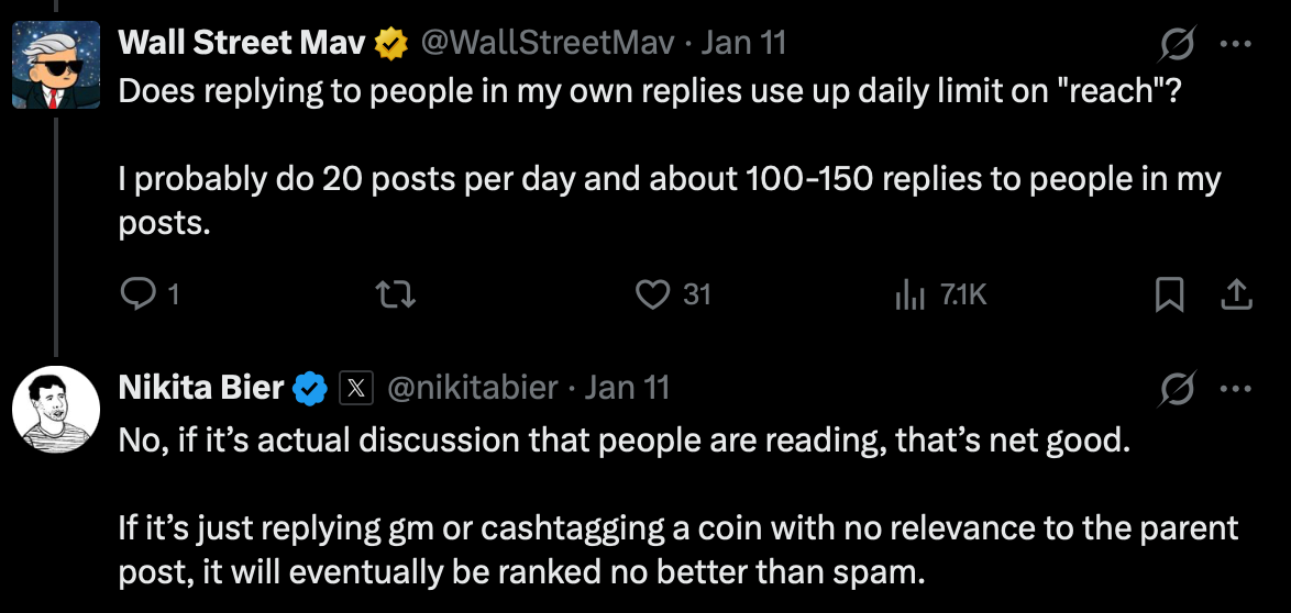 Nikita 更新后的说法是,如果你只是毫无目的地在某条推文下刷和推文内容毫不相关的「gm」或者不管不顾地在评论区推销某个币,才会被认为是垃圾信息从而被限流。