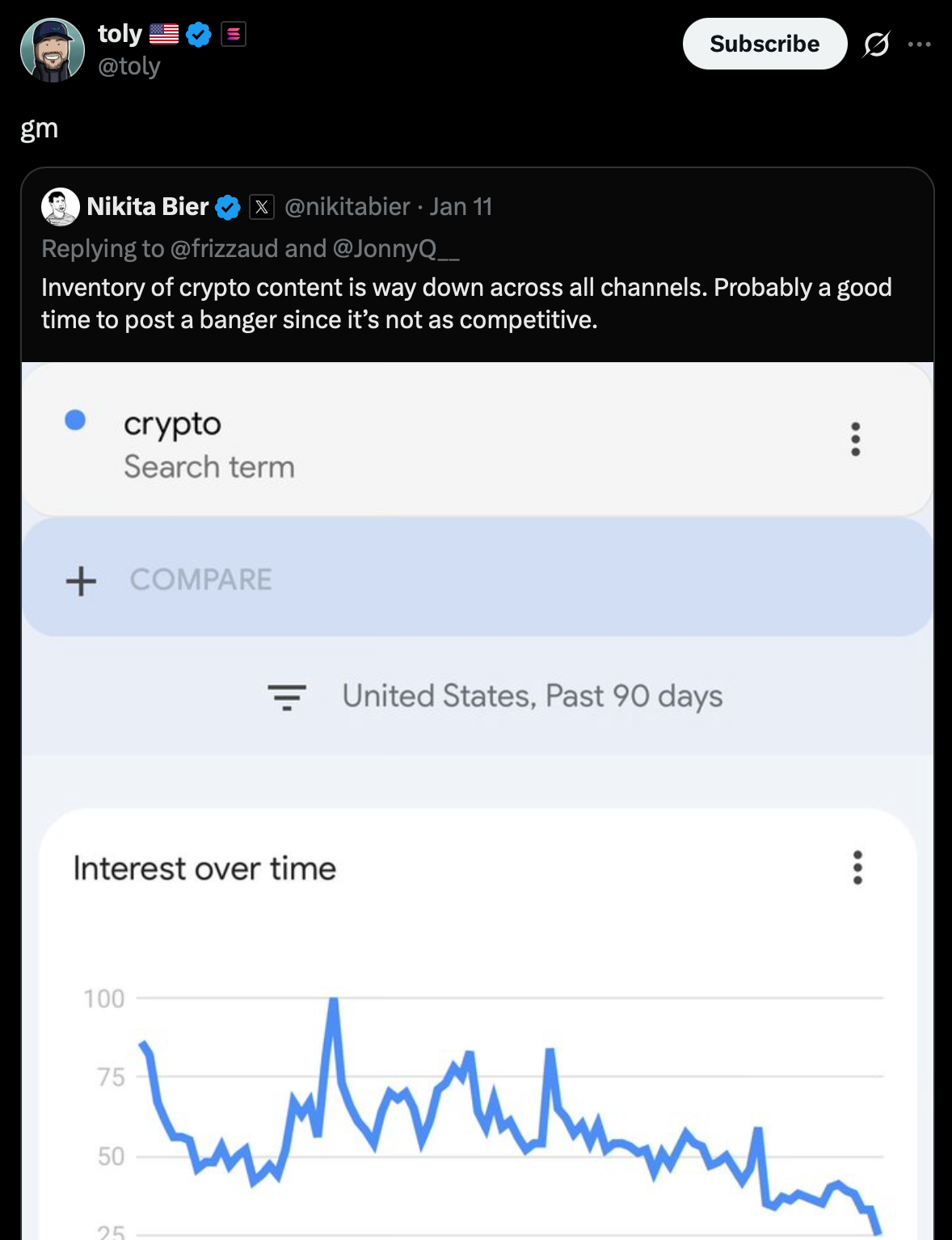 SOLAna 联合创始人 toly 引用了 Nikita 的一条表示币圈现在在各平台讨论度低、是创作高质量内容以脱颖而出的好时机的推文,而引用的内容则是,「gm」。
