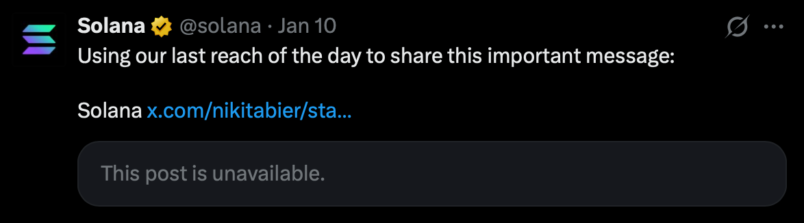 SoLAna 在这次「币命贵」运动里堪称带头冲锋,其运营展现了敏锐的网感。经典之作还包括引用了 Nikita 那条已删除的回复,并附上,「用掉我们今天最后的曝光度,以向您传递来自 Nikita 的重要信息,Solana」。