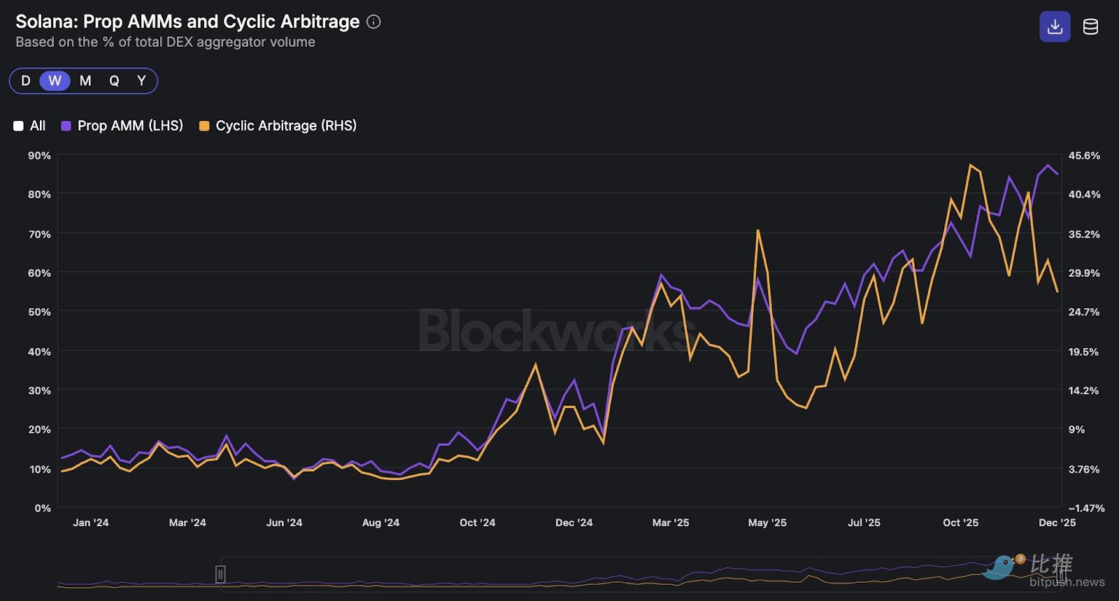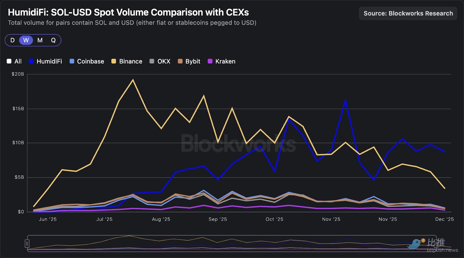 从这一趋势来看,主动做市 AMM 目前在 SOL-美元交易对上的交易量已超过 CEX。下图显示,过去四周,HumidiFi 的周均 SOL-美元交易量超过 90 亿美元,超过了币安,成为第一大交易场所。