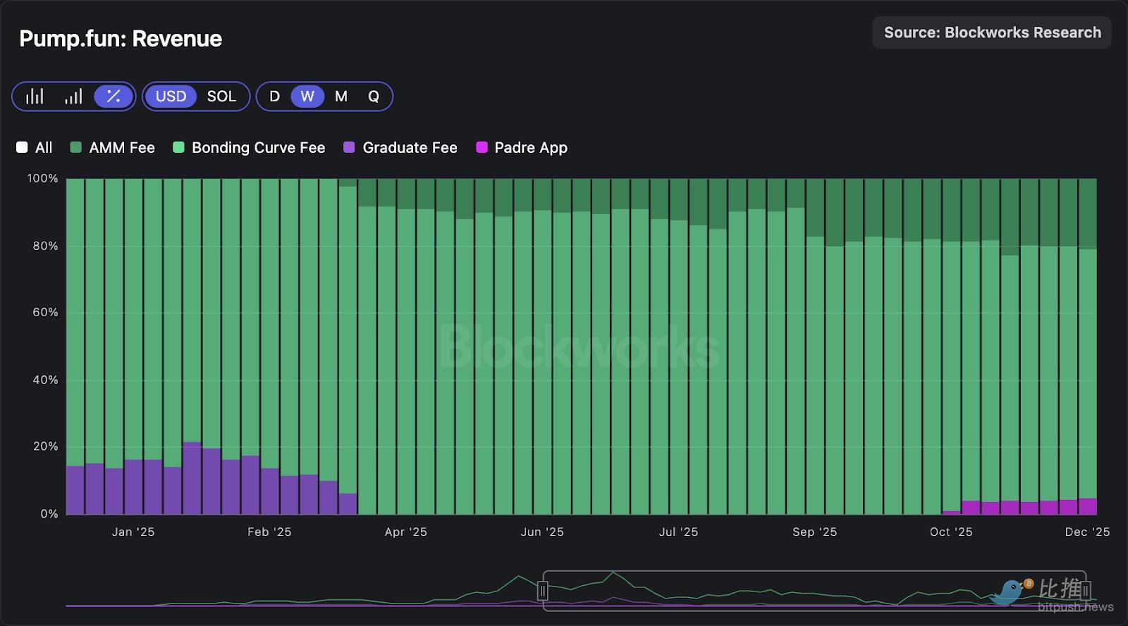 我们已在先前的研究中详细讨论过这一点,因此这里将专注于最有趣的方面。Pump 可以说是垂直整合 DEX 理论的首个体现,它是自上而下从发行开始构建的,而非相反。在通过其启动板确保发行渠道和订单流之后,Pump 引入了其被动 AMM 以捕获下游交易活动。这种整合显著地使 Pump 的收入来源多样化,不再仅仅依赖绑定曲线机制。下图显示,Pump 现在对整个代币生命周期的活动进行货币化,AMM 手续费现已贡献其总收入的 20% 以上。