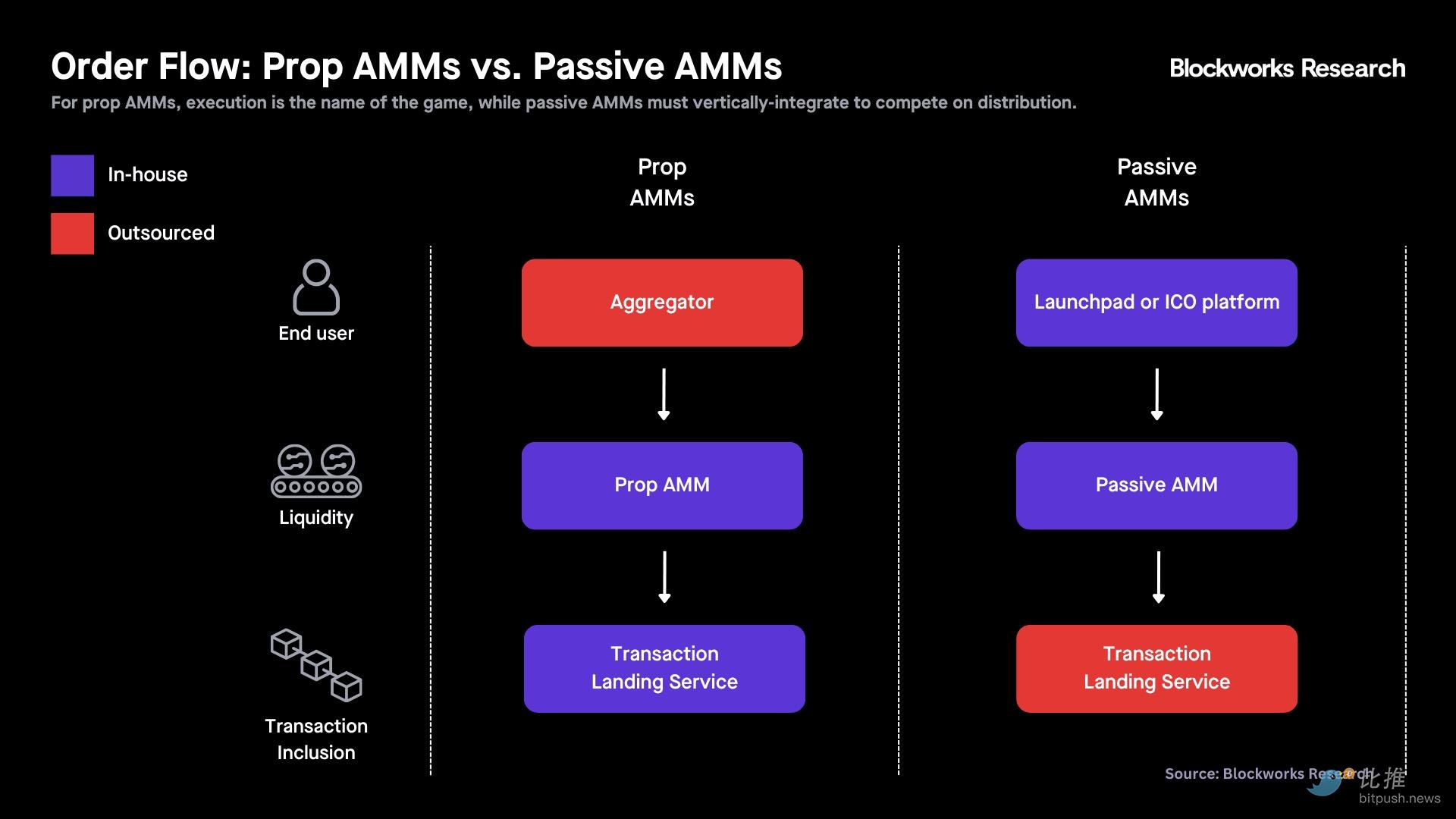 - 两类 AMM 的致胜策略截然不同:它们均可受益于垂直整合,但方向相反。被动 AMM 正通过代币发行平台(如 Pump-PumpSwap、metaDAO-Futarchy AMM)贴近用户,而主动做市 AMM 则向下游延伸,专注于交易落地服务(如 HumidiFi-Nozomi)。
