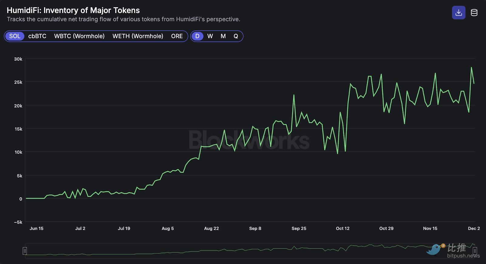 HumidiFi 的收入虽然 HumidiFi 的收入未公开,但我们可以通过观察其自成立以来的代币库存增量来估算。核心思路是,由于 HumidiFi 实质上充当做市柜台(主动做市 AMM 中只有一个 LP),每一笔与其进行的交易都有赢家和输家。随着时间的推移,做市商的净库存变化反映了交易盈亏。因此,我们可以从 HumidiFi 的角度追踪各种代币的累计净交易流量,作为其收入的代理指标。