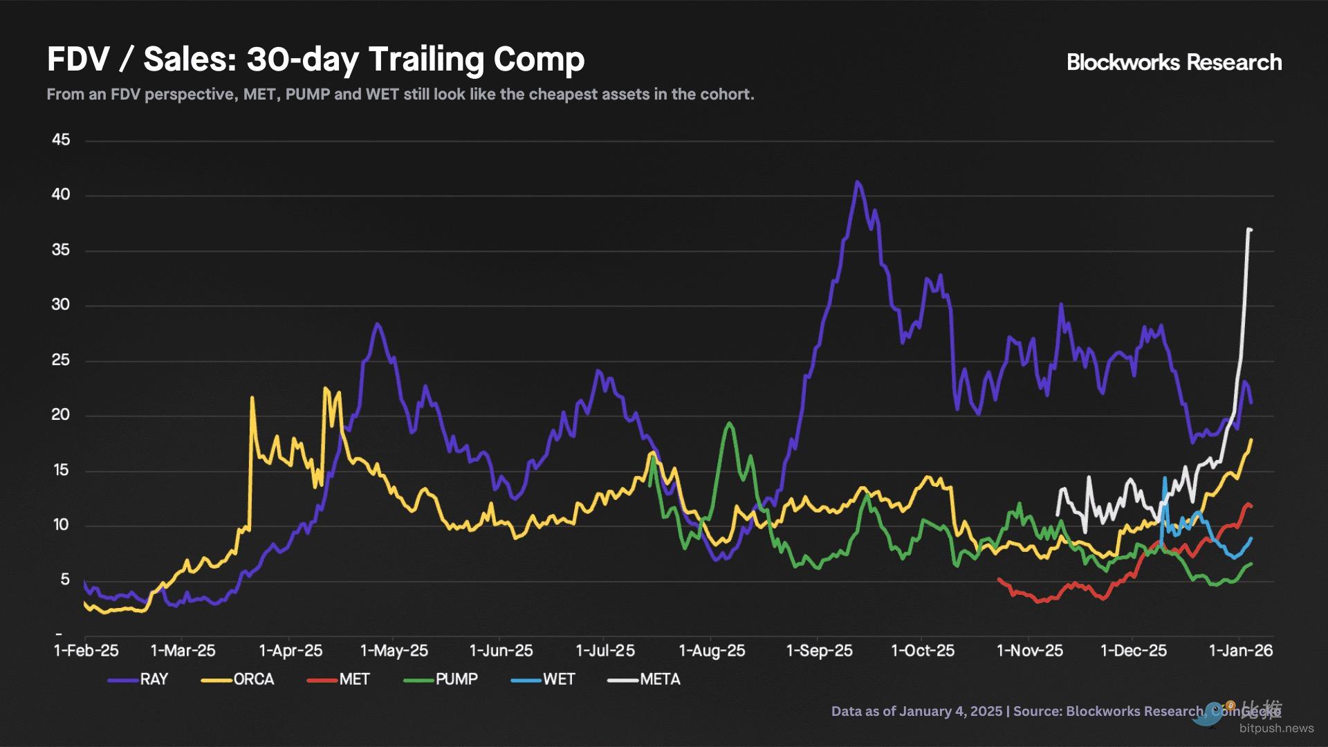 完全稀释估值(FDV)与收入比率在完全稀释 P/S 基础上,META 和 RAY 是同类中最贵的。就 Raydium 而言,鉴于其更具挑战性的未来交易量轨迹以及对发行层缺乏持久控制力,我们难以证明其溢价的合理性。相比之下,MET、WET 和 PUMP 的倍数在同类中最低,分别为 12 倍、9 倍和 7 倍。