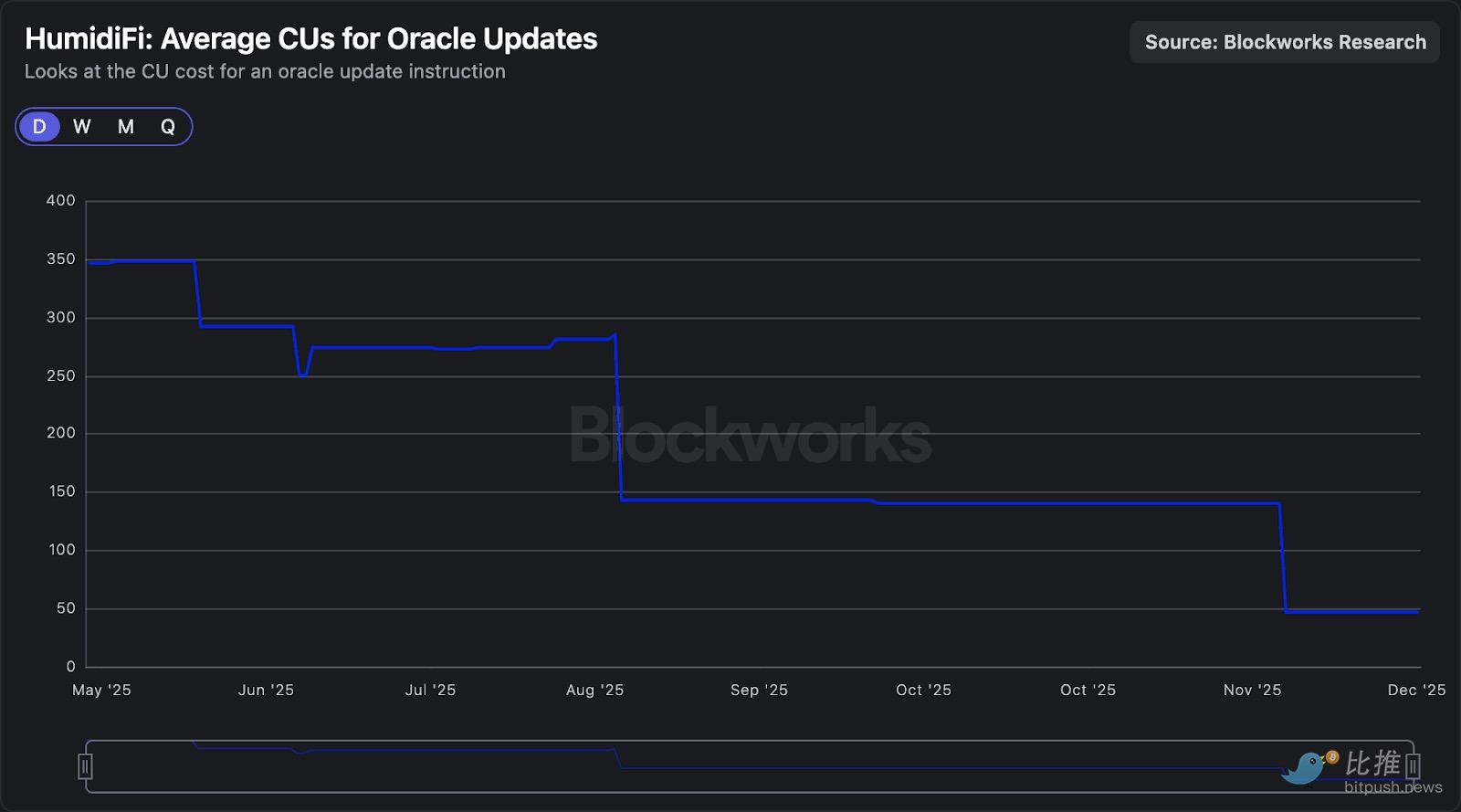 这些预言机更新交易经过高度优化,以消耗尽可能少的计算单元。由于区块中的交易按每 CU 支付的优先费用排序,更轻量级的预言机更新可以使交易在区块中以更低的总交易费获得更高的排序。交易排序至关重要,因为存在在吃单者套利前更新报价的竞赛。下图显示,HumidiFi 积极优化了其预言机更新指令,将计算量减少至 47 CU,比 6 月推出时下降了超过 85%。