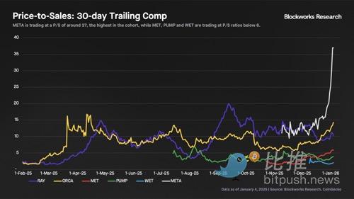 不过,META 当前约 36 倍的市销率远高于其历史平均水平(约 15 倍),这表明市场正在提前消化一系列近期催化剂。过去一周 META 上涨约 40%,推动估值倍数扩张,而过去一个月由于 ICO 活动暂时放缓,其近期收入实则有所回落。展望未来,以下几项进展有望推动其收入回升: