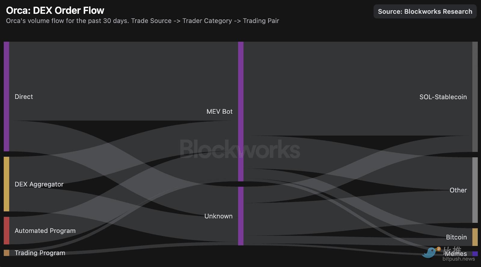 在更细粒度层面,下图所示的订单流图表显示,Orca 的 SOL-稳定币交易量中至少有 85% 可归因于「MEV 机器人」活动。不过,大部分流量似乎来自 WinterMute 的公共做市机器人,而非纯粹针对过时报价的投机性套利。