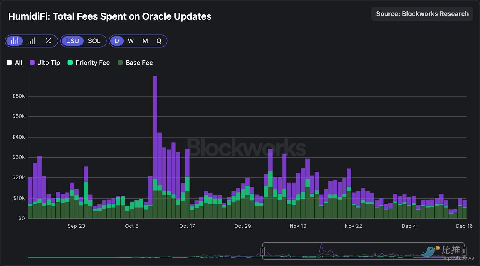 尽管每次预言机更新交易大约支付 0.0016 美元,但自将总计算量降至 500 CU 以下以来,HumidiFi 平均每天进行约 600 万次更新(每秒约 70 次!)。按此速率,HumidiFi 每天在交易打包费用(基础费用+优先费用+Jito 小费)上的支出约为 9,000 至 10,000 美元。