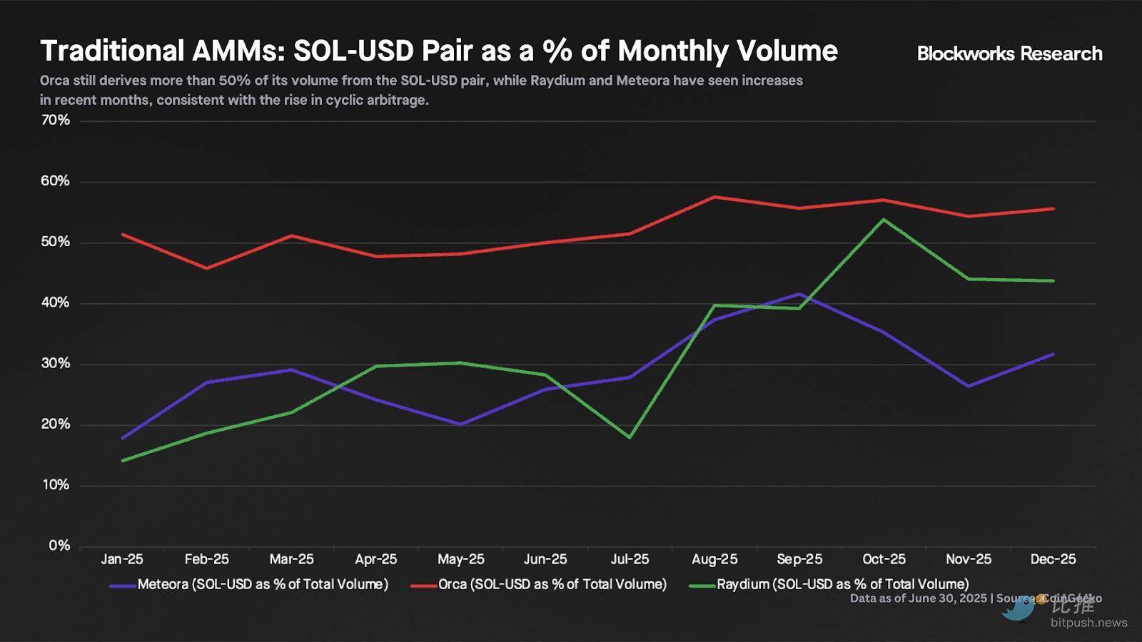 观察传统 AMM 的交易量构成,Orca 仍有超过 50% 的交易量来自 SOL-稳定币交易对。与此同时,Meteora 和 Raydium(这两个场所的活动曾严重偏向迷因币)近几个月的 SOL-稳定币交易量有所上升,这与前文提到的循环套利份额增长趋势一致。