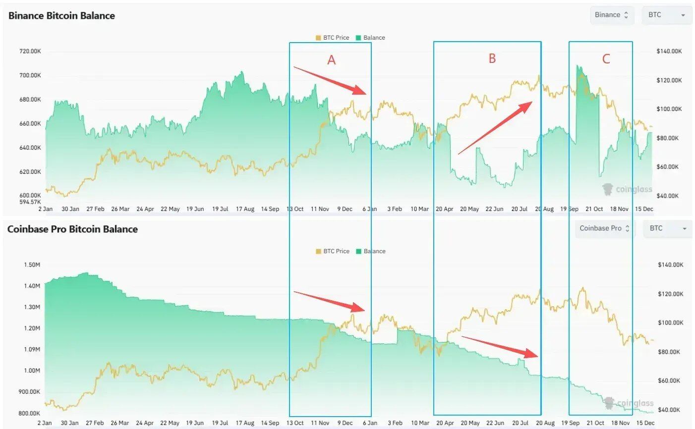 Coinbase BTC Balance 周期内持续下行,CEX 侧的可售筹码减少。与之对照,Binance Balance 在 B、C 两个阶段随价格反弹而显著上升,对应 offshore 现货的潜在抛压增加。