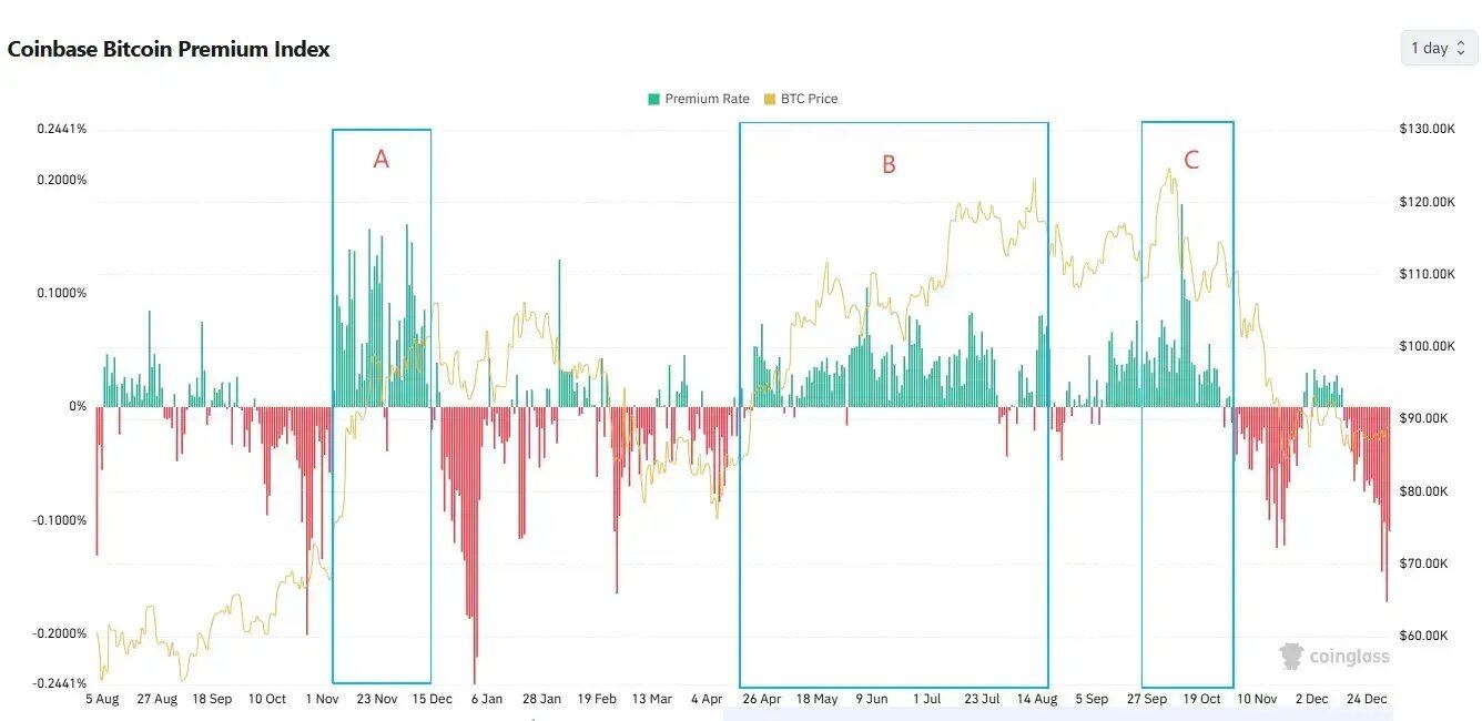 现货:Onshore 是主要买方,Offshore 更偏逢高减仓CoinBase Premium 在 A/B/C 三个冲顶阶段均维持正溢价,说明高位买盘主要来自以 Coinbase 为代表的 onshore 现货资金。