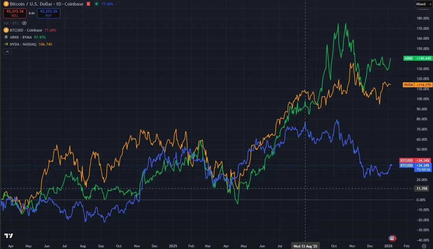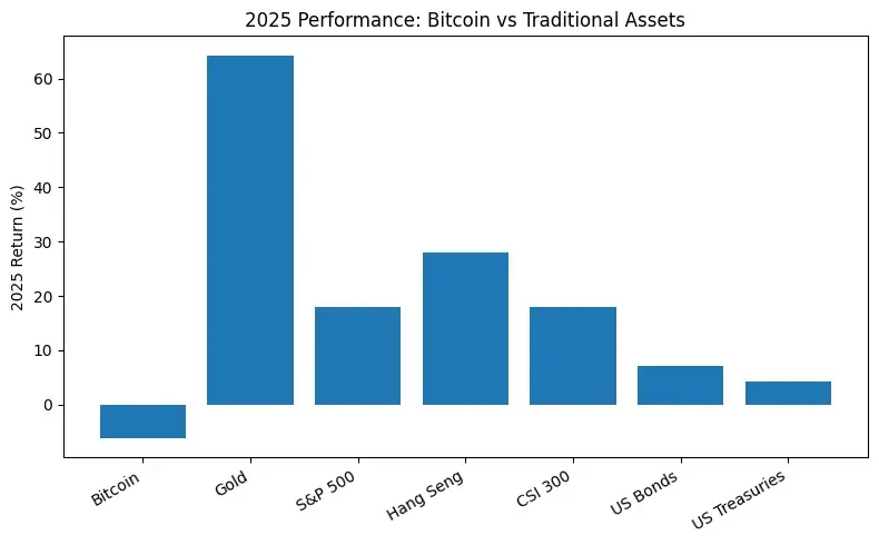 跨资产层面,即便在政策友好和制度红利释放的背景下,btc 在 2025 年明显跑输黄金、美股、港股、A 股等主要 TradFi 资产,是少数未能跟随全球风险资产创出同步新高的资产之一。