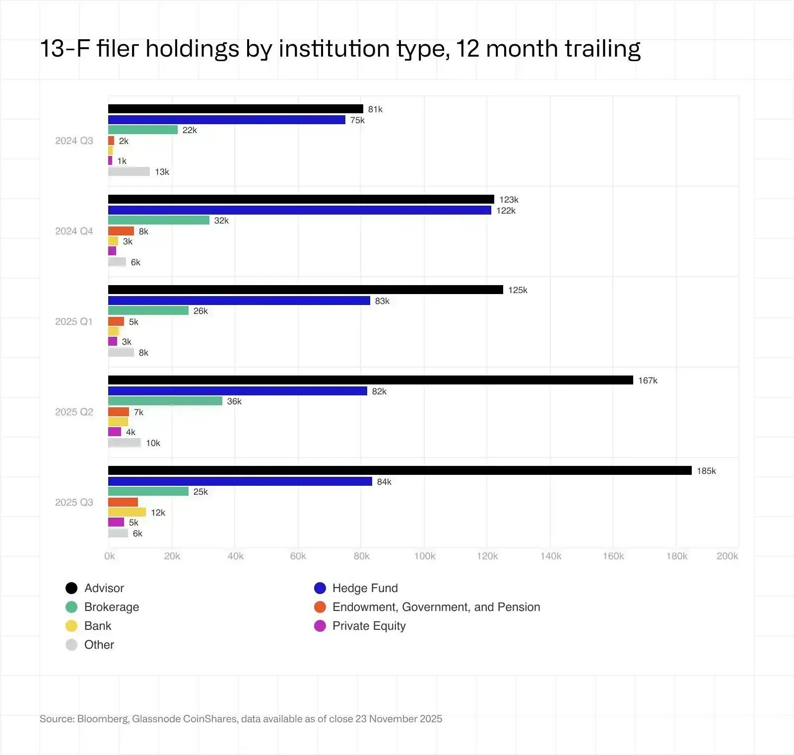· 机构(狭义 13F-filer)持有量不足四分之一,所以 ETF 整体 AUM 仍以非机构资金为主;
