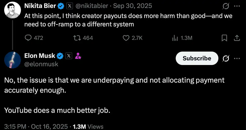 虽然订阅用户(X Premium)在 2025 年有显著增长,但其收入贡献远低于马斯克最初设想的「占总收入 50%」的目标。因此,X 将 Premium 订阅的增长与创作者的收益直接挂钩,不仅要提供更高的创作者收益,还明确将收益计算基于付费用户的浏览量(Verified Home TimeLine impressIons),以此激励创作者产出能吸引付费用户的高质量内容,从而推动更多用户订阅 Premium 服务。