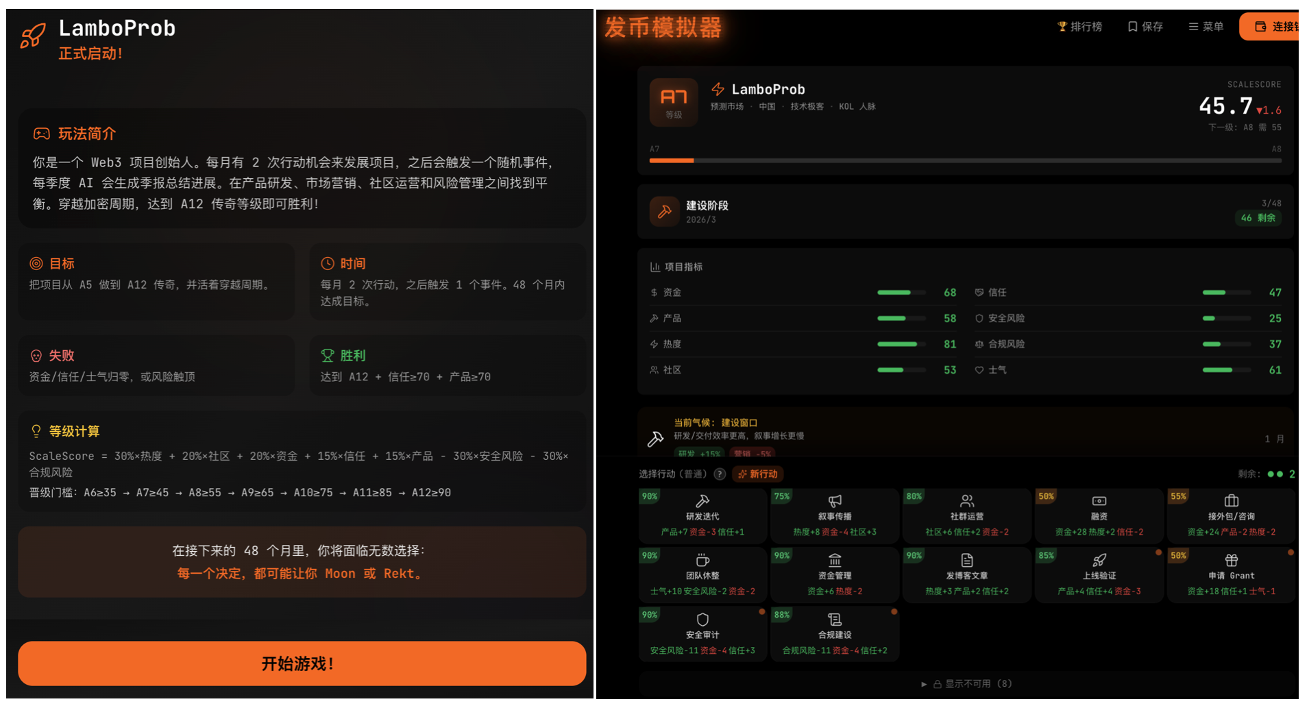 一个小操作周期是一个月,只能做两件事,所以资源是有限的。把有限的资源和钱投进产品研发、或者叙事传播,或者社群运营等等,游戏并不会告诉你哪条路是对的。于是会有一个个不确定的事件弹出来,有时候是融资顺利,有时候是监管盯上你,有时候是社区突然失控,有时候是安全风险开始爆发。