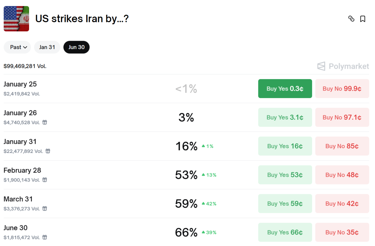 PolymARKet 数据显示,市场押注美国将会在 2 月 28 日前对伊朗动武的概率已升至 53%。目前该预测市场成交额将近 1 亿美元。