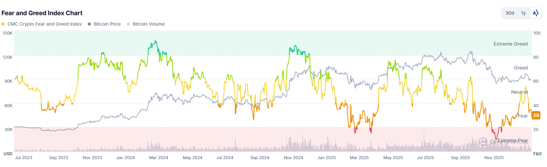 据 CoingLAss 数据,过去 12 小时内,加密市场总爆仓金额高达 6.03 亿美元,其中多单爆仓 5.53 亿美元。恐慌指数目前报 29,处于「极端恐惧」区间。