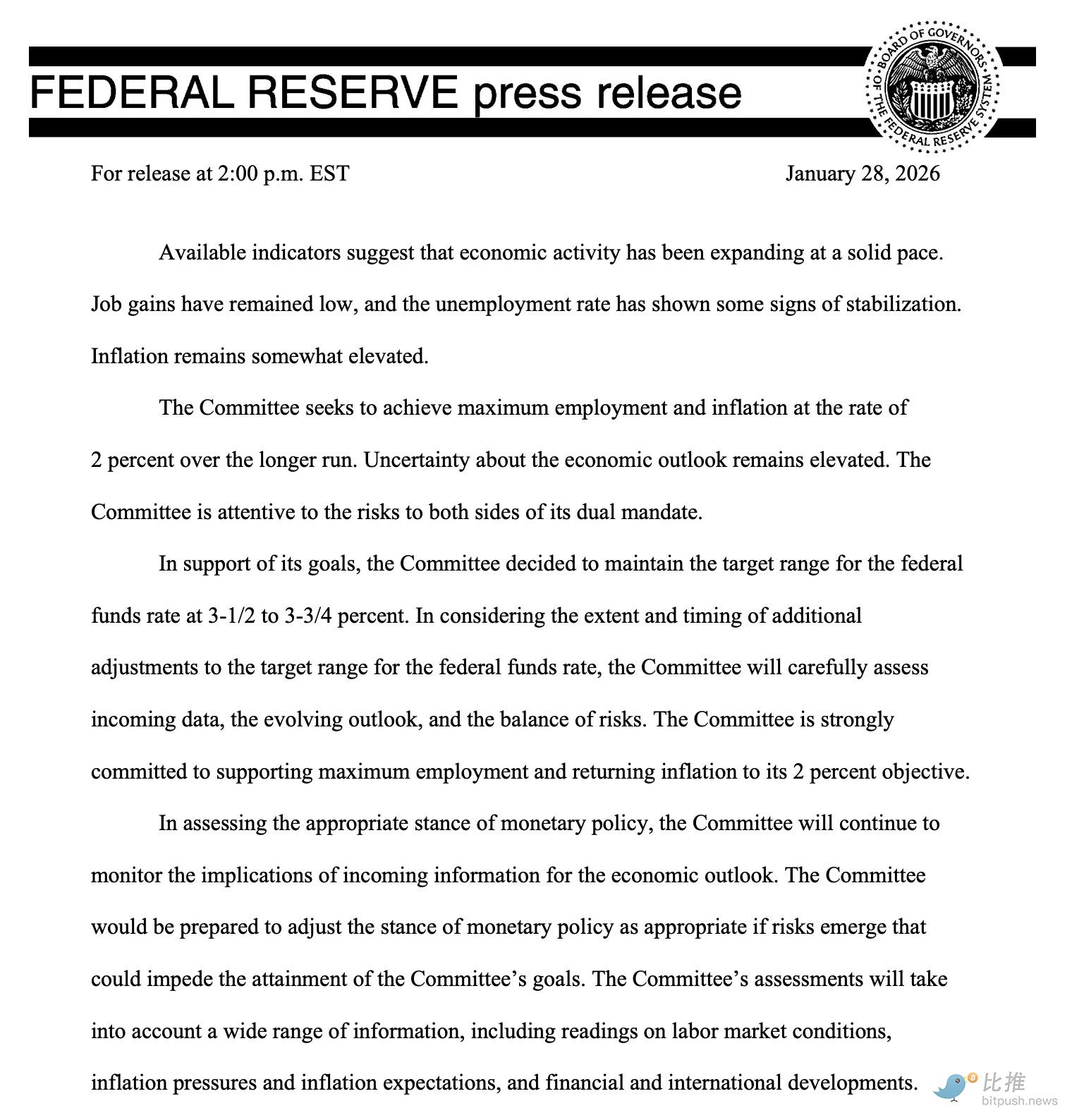 在连续三次降息后,美联储终于在 2026 年的首场议息会议上按下了「暂停键」。