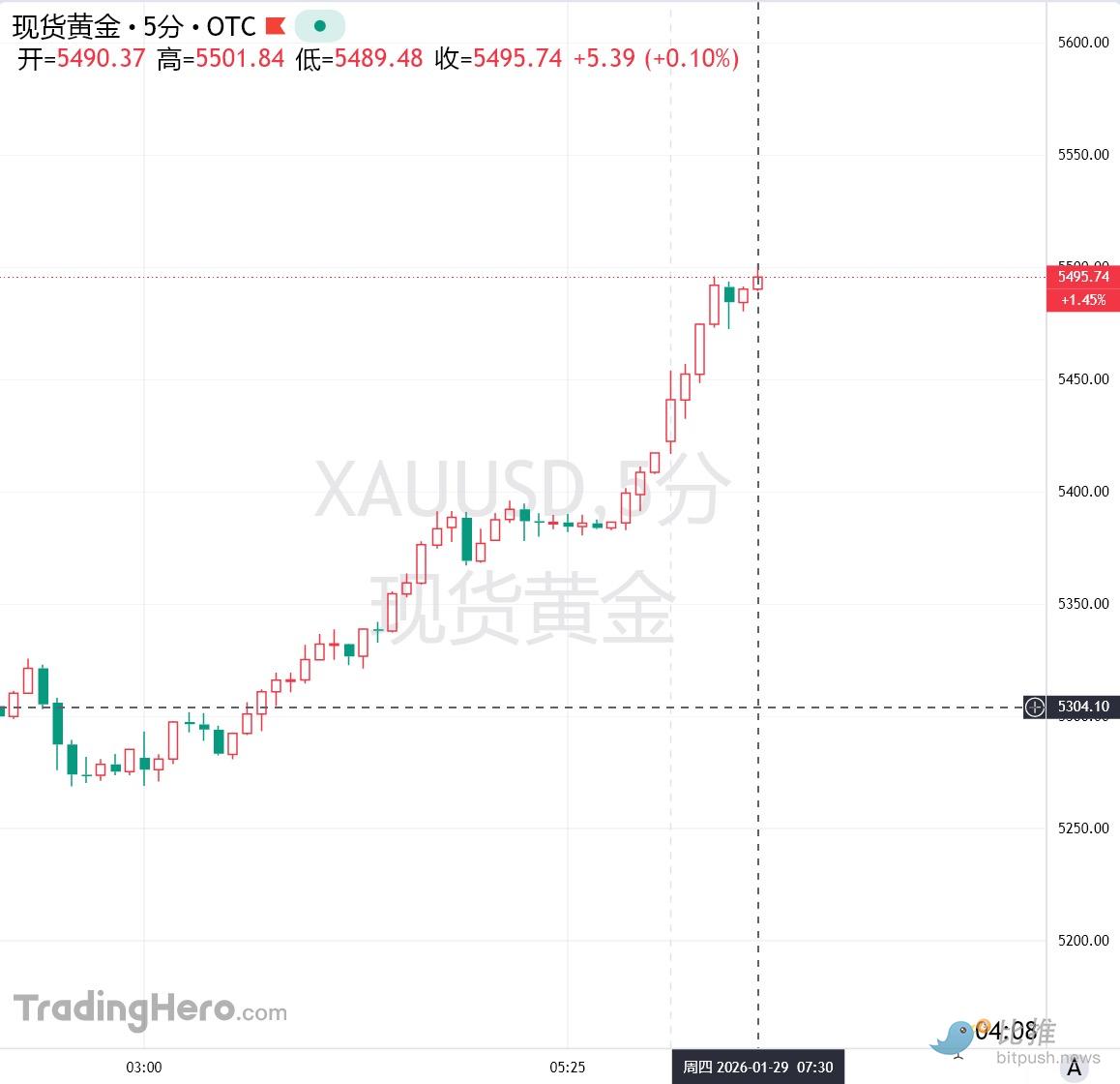 利率决议公布后,现货黄金价格一路飙升,首次突破 5500 美元/盎司大关。短短四个交易日内,金价从略低于 5000 美元一路上行,连破多道整百关口,累计上涨超过 500 美元,周涨幅达到 10%。这一速度和幅度,使黄金成为当下全球市场毫无争议的主角。