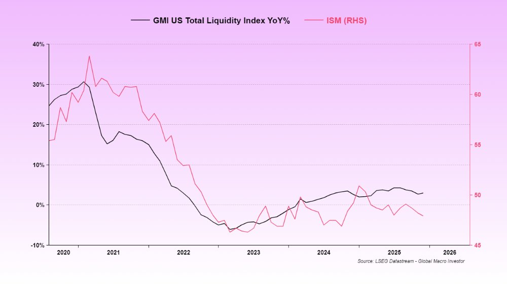 到目前为止始终偏弱的流动性,正是 ISM 指数持续处于低位的原因。