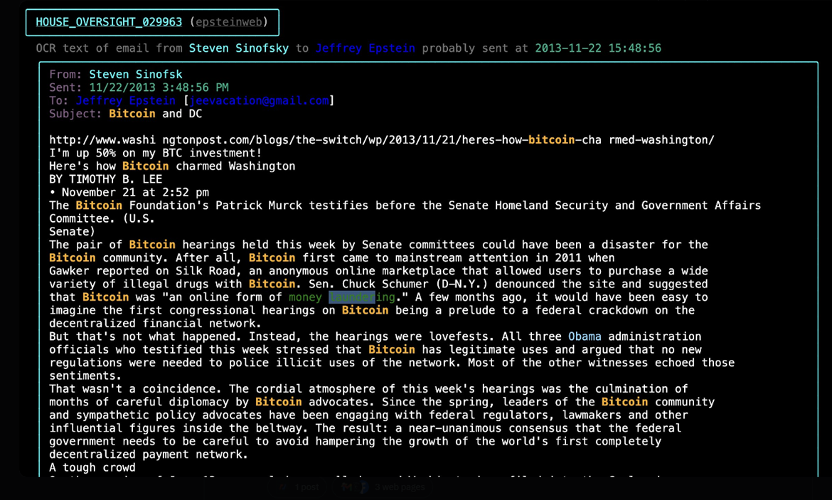 a16z 董事会合伙人,曾任微软 Windows 部门总裁的 StEVEn Sinofsky 在邮件中向爱泼斯坦表示,他的比特币投资已经上涨了 50%,并分享了 TIMOthy B. Lee 的文章「比特币如何迷住华盛顿」。