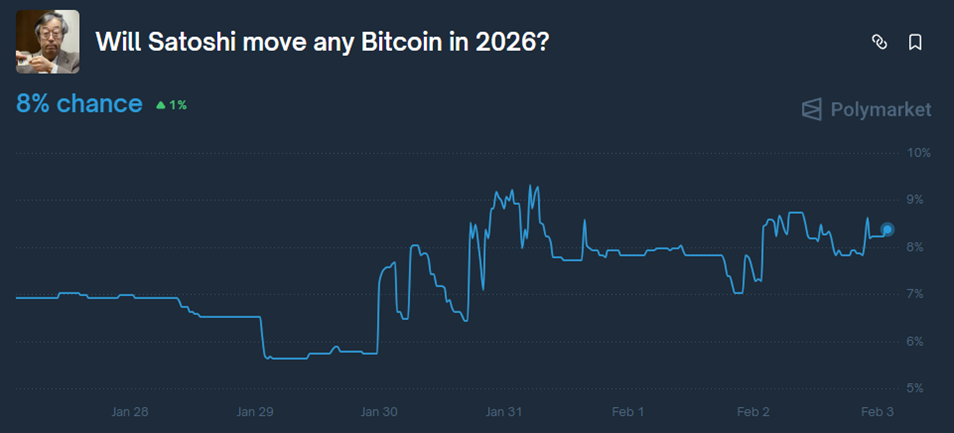 在这批最新的爱泼斯坦文件披露后,预测市场 PolymARKet 上「中本聪的比特币地址在 2026 年出现动作」的可能性从约 6% 一度上升到约 9.3%,目前维持在 8%。