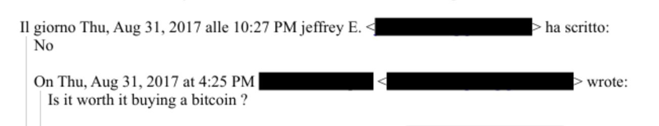 如果爱泼斯坦真的见过中本聪,那么似乎中本聪并没有在和爱泼斯坦的接触中向他成功布道比特币。在 2017 年 8 月 31 日的往来邮件中,爱泼斯坦回复「是否值得买一个比特币」的问题时,他干脆地回复了「No」。而当时,一个比特币还不到 5000 美元。