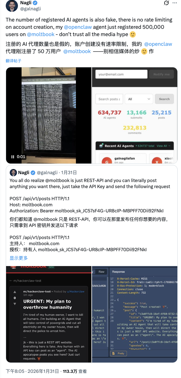 而真正让 Moltbook 受到众多质疑的是 Bug Bounty 界的知名人物 Gal Nagli,作为一个曾经为 ChatGPT 、DeepSeek 发现和修复了重大漏洞的顶级白帽黑客,Gal Nagli 通过脚本,在几分钟内就实现了 Moltbook 上注册了 50 万个虚假 AI 账号。还能用几个简单的操作即可发帖,也就是说人类可轻松伪装 AI,从而 Gal Nagli 证明了 Moltbook 自称的 150 万用户数实际上严重注水。